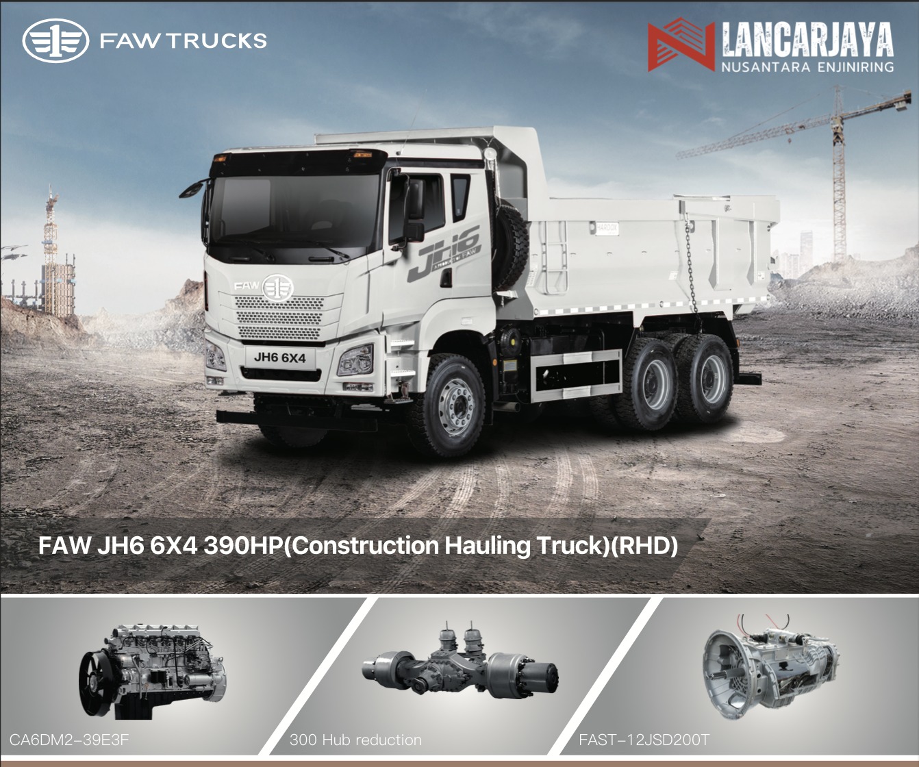 The FAW JH6 6x4 390HP is a robust construction hauling truck designed for heavy-duty operations. It features a right-hand drive (RHD) configuration, making it suitable for regions with left-side driving. Powered by a 390 horsepower engine, this truck is built for reliability and efficiency in tough construction environments. The 6x4 drivetrain provides excellent traction and stability, ideal for hauling large loads over rough terrains. With its durable construction and advanced features, the FAW JH6 is a dependable choice for demanding construction tasks.